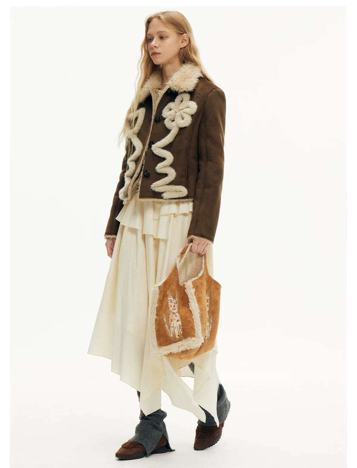 Lucky Cat Suede Shearling Tote Bag